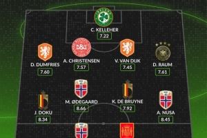 中场:多库(比利时,8.34分)、厄德高(挪威,8.66分)、德布劳内(比利时,7.92分)、安东尼奥·努萨(挪威,8.45分)